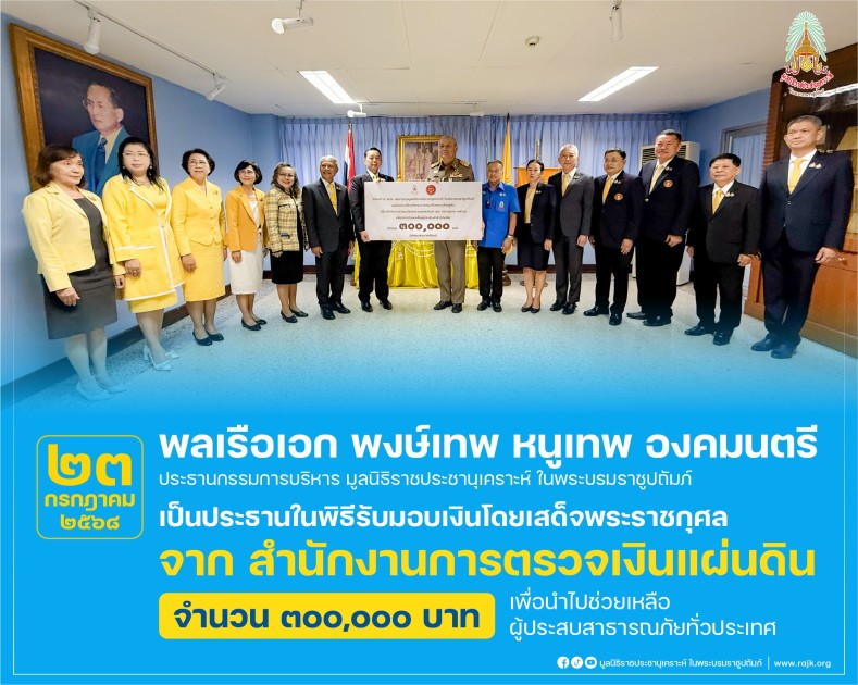 พลเรือเอก พงษ์เทพ หนูเทพ องคมนตรี ประธานกรรมการบริหาร มูลนิธิราชประชานุเคราะห์ ในพระบรมราชูปถัมภ์ เป็นประธานในพิธีรับมอบเงินโดยเสด็จพระราชกุศล จาก โครงการ “สตง. สมทบทุนมูลนิธิราชประชานุเคราะห์ ในพระบรมราชูปถัมภ์ เฉลิมพระเกียรติพระบาทสมเด็จพระเจ้าอยู่หัว เนื่องในโอกาสวันเฉลิมพระชนมพรรษา ๒๘ กรกฎาคม ๒๕๖๘” โดยนายเฉลิมพล เพ็ญสูตร ประธานกรรมการตรวจเงินแผ่นดิน นายมณเฑียร เจริญผล ผู้ว่าการตรวจเงินแผ่นดิน และคณะ จำนวน ๓๐๐,๐๐๐ บาท เพื่อนำไปช่วยเหลือผู้ประสบสาธารณภัยทั่วประเทศ