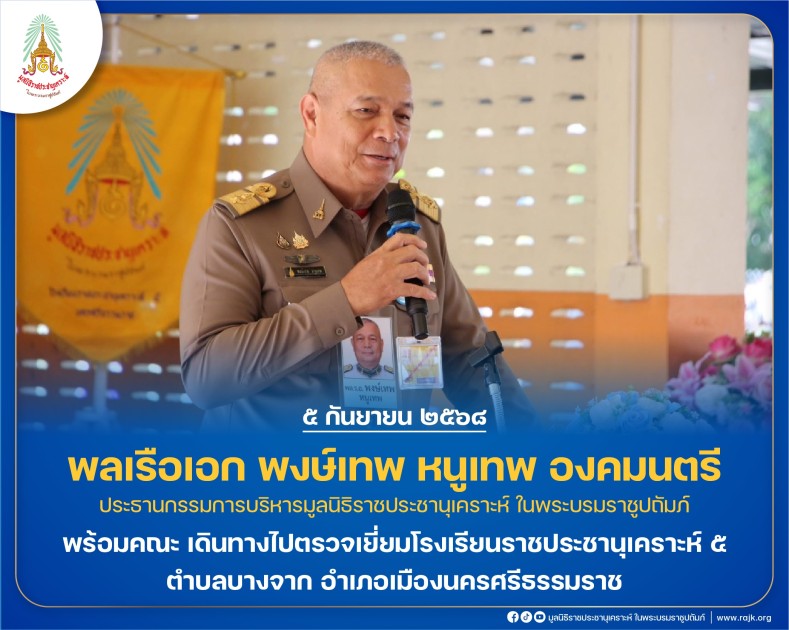 พลเรือเอก พงษ์เทพ หนูเทพ องคมนตรี ประธานกรรมการบริหาร มูลนิธิราชประชานุเคราะห์ ในพระบรมราชูปถัมภ์ พร้อมคณะ เดินทางไปตรวจเยี่ยมโรงเรียนราชประชานุเคราะห์ ๕ ตำบลบางจาก อำเภอเมืองนครศรีธรรมราช