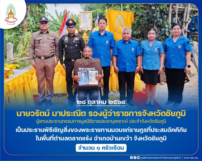 นายวรัตม์ มาประณีต รองผู้ว่าราชการจังหวัดชัยภูมิ ผู้แทนประธานกรรมการมูลนิธิราชประชานุเคราะห์ ประจำจังหวัดชัยภูมิ เป็นประธานพิธีเชิญสิ่งของพระราชทานมอบแก่ราษฎรที่ประสบอัคคีภัย ในพื้นที่ตำบลตลาดแร้ง อำเภอบ้านเขว้า จังหวัดชัยภูมิ จำนวน ๑ ครัวเรือน