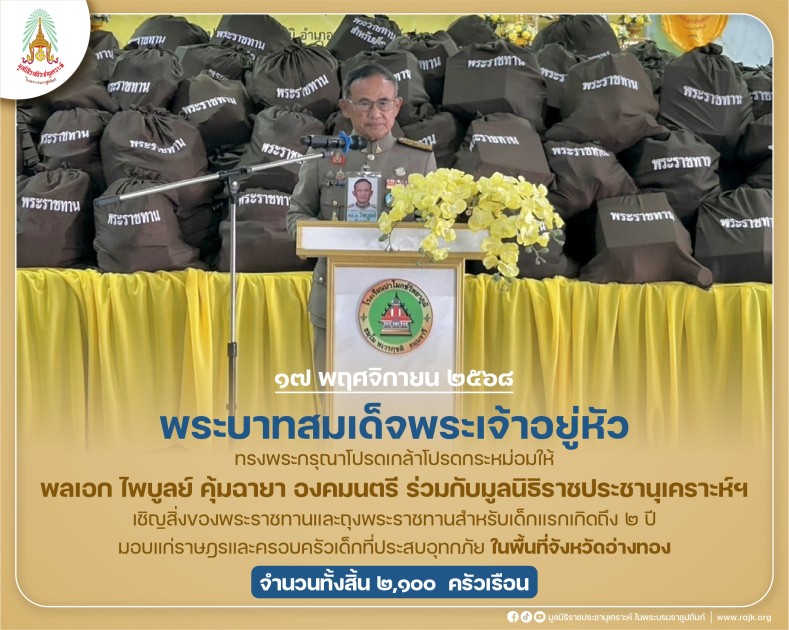 พระบาทสมเด็จพระเจ้าอยู่หัว ทรงพระกรุณาโปรดเกล้าโปรดกระหม่อมให้ พลเอก ไพบูลย์ คุ้มฉายา องคมนตรี ร่วมกับมูลนิธิราชประชานุเคราะห์ ในพระบรมราชูปถัมภ์ เชิญสิ่งของพระราชทานและถุงพระราชทานสำหรับเด็กแรกเกิดถึง ๒ ปี มอบแก่ราษฎรและครอบครัวเด็กที่ประสบอุทกภัย ในพื้นที่จังหวัดอ่างทอง