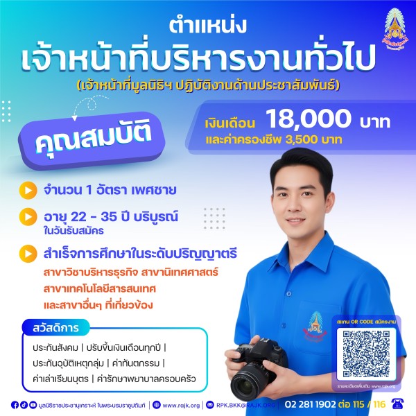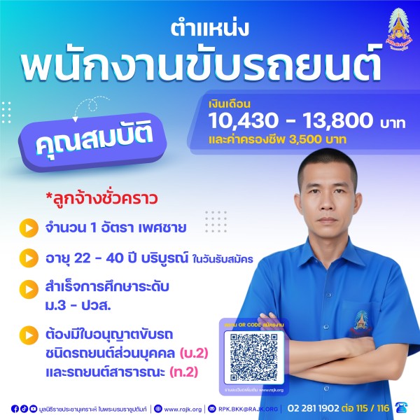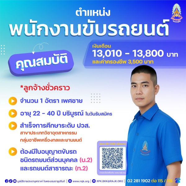 🎉🎉ประกาศรับสมัครงาน🎉🎉มูลนิธิราชประชานุเคราะห์ ในพระบรมราชูปถัมภ์ 🎉รับสมัครงานบุคคลทั่วไป จำนวน 4 อัตรา📍ตำแหน่ง เจ้าหน้าที่บริหารงานทั่วไป จำนวน 1 อัตรา (เจ้าหน้าที่มูลนิธิ)📍ตำแหน่ง พนักงานพัสดุ จำนวน 1 อัตรา (ลูกจ้างชั่วคราว)📍ตำแหน่ง พนักงานขับรถยนต์ จำนวน 2 อัตรา (ลูกจ้างชั่วคราว)💙กดสมัครและรายละเอียดคลิกที่นี่ : https://forms.gle/7M79nNJs4Ahp1PDF7🔗Link ประกาศ : https://drive.google.com/file/d/1GIHpdFE1gzCeAr72sX5tWDEBaE_4nhtY/view?usp=sharing⚠️ปิดรับใบสมัครในวันศุกร์ ที่ 12 ธันวาคม 2568 📞สอบถามข้อมูลเพิ่มเติม : โทร. 02 281 1902 ต่อ 115 / 116 🗓️วันเวลาทำงาน : จ.-ศ. เวลา 08.30 - 16.30 น. ❗️มีเข้าเวรวันหยุด และลงพื้นที่ต่างจังหวัด🏢สถานที่ปฏิบัติงาน :สำนักงานมูลนิธิราชประชานุเคราะห์ฯ ถนน