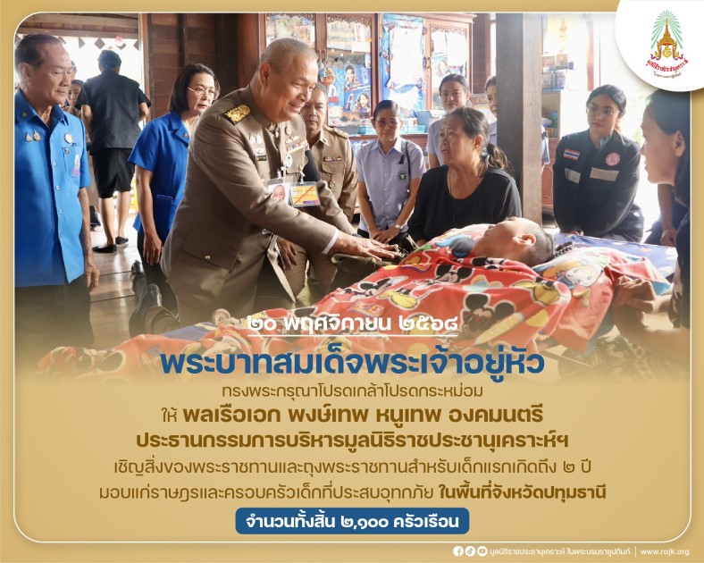พระบาทสมเด็จพระเจ้าอยู่หัว ทรงพระกรุณาโปรดเกล้าโปรดกระหม่อมให้ พลเรือเอก พงษ์เทพ หนูเทพ องคมนตรี ประธานกรรมการบริหารมูลนิธิราชประชานุเคราะห์ ในพระบรมราชูปถัมภ์ เชิญสิ่งของพระราชทานและถุงพระราชทานสำหรับเด็กแรกเกิดถึง ๒ ปี มอบแก่ราษฎรและครอบครัวเด็กที่ประสบอุทกภัย ในพื้นที่จังหวัดปทุมธานี