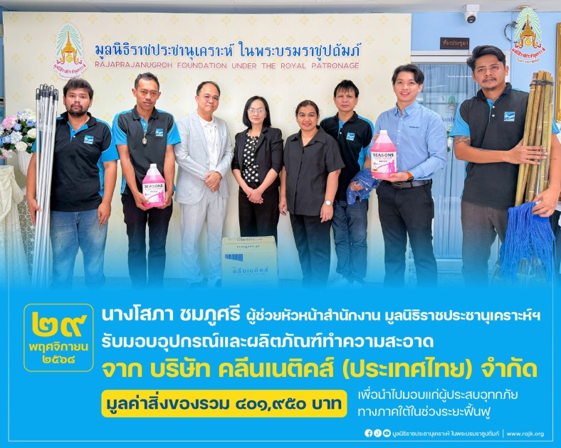 นางโสภา ชมภูศรี ผู้ช่วยหัวหน้าสำนักงาน มูลนิธิราชประชานุเคราะห์ฯ รับมอบอุปกรณ์และผลิตภัณฑ์ทำความสะอาด จาก บริษัท คลีนเนติคส์ (ประเทศไทย) จำกัด มูลค่าสิ่งของรวม ๔๐๑,๙๕๐ บาท เพื่อนำไปมอบแก่ผู้ประสบอุทกภัยทางภาคใต้ในช่วงระยะฟื้นฟู