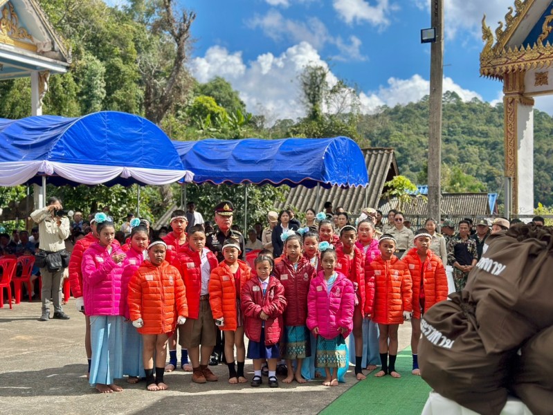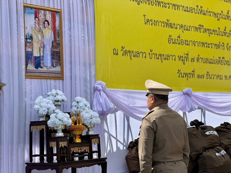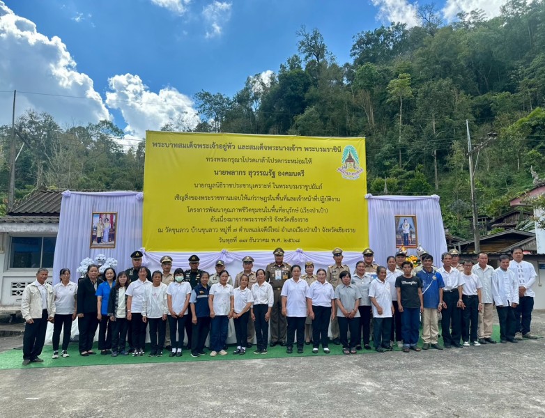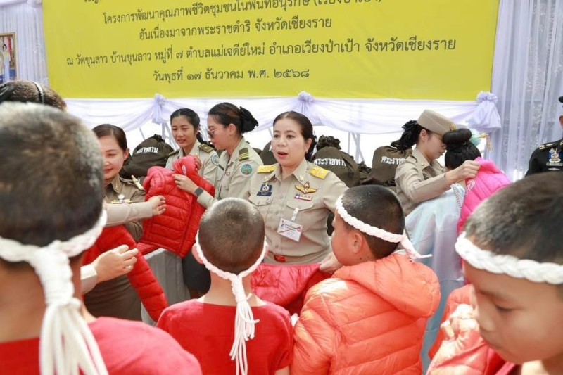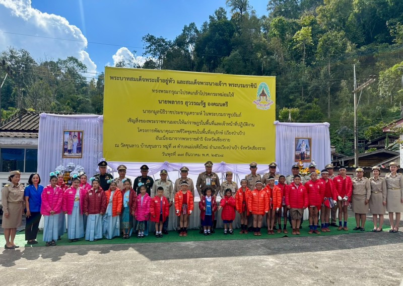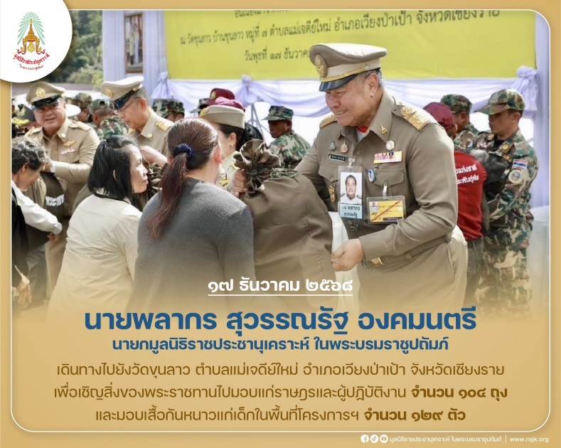 นายพลากร สุวรรณรัฐ องคมนตรี นายกมูลนิธิราชประชานุเคราะห์ ในพระบรมราชูปถัมภ์ ประธานอนุกรรมการติดตามและขับเคลื่อนโครงการอันเนื่องมาจากพระราชดำริในพื้นที่ภาคเหนือ พร้อมด้วยนางสุพร ตรีนรินทร์ เลขาธิการ กปร. เจ้าหน้าที่มูลนิธิราชประชานุเคราะห์ ในพระบรมราชูปถัมภ์ และคณะอนุกรรมการฯ เดินทางไปยังวัดขุนลาว ตำบลแม่เจดีย์ใหม่ อำเภอเวียงป่าเป้า จังหวัดเชียงราย เพื่อเชิญสิ่งของพระราชทาน ไปมอบแก่ราษฎรและผู้ปฏิบัติงานโครงการพัฒนาคุณภาพชีวิตชุมชนในพื้นที่อนุรักษ์ (เวียงป่าเป้า) อันเนื่องมาจากพระราชดำริ ประกอบด้วย เสื้อกันหนาวมอบให้แก่เด็กในพื้นที่โครงการฯ จำนวน ๑๒๙ ตัว และถุงพระราชทานมอบให้แก่ราษฎรและผู้ปฏิบัติงานในพื้นที่โครงการฯ จำนวน ๑๐๔ ถุง