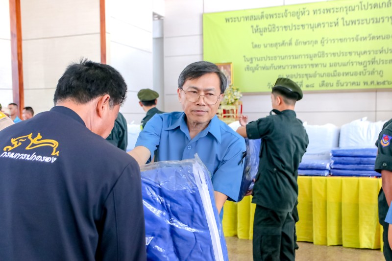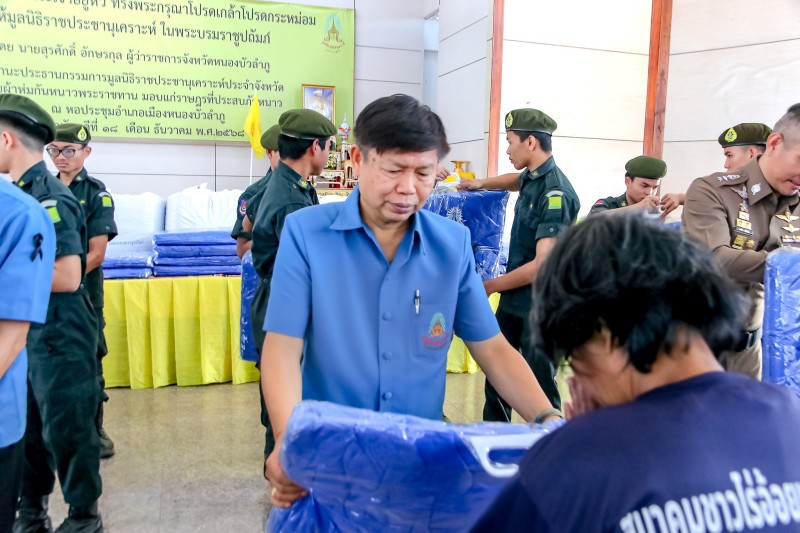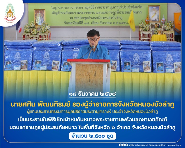 นายศศิน พัฒนภิรมย์ รองผู้ว่าราชการจังหวัดหนองบัวลำภู ผู้แทนประธานกรรมการมูลนิธิราชประชานุเคราะห์ ประจำจังหวัดหนองบัวลำภู เป็นประธานในพิธีเชิญผ้าห่มกันหนาวพระราชทานพร้อมชุดยาเวชภัณฑ์ มอบแก่ราษฎรผู้ประสบภัยหนาว ในพื้นที่จังหวัด ๖ อำเภอ จังหวัดหนองบัวลำภู จำนวน ๒,๕๐๐ ชุด