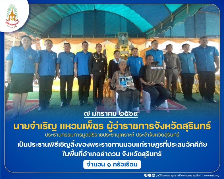 นายจำเริญ แหวนเพ็ชร ผู้ว่าราชการจังหวัดสุรินทร์ ประธานกรรมการมูลนิธิราชประชานุเคราะห์ ประจำจังหวัดสุรินทร์ เป็นประธานพิธีเชิญสิ่งของพระราชทานมอบแก่ราษฎรที่ประสบอัคคีภัย ในพื้นที่อำเภอลำดวน จังหวัดสุรินทร์ จำนวน ๑ ครัวเรือน