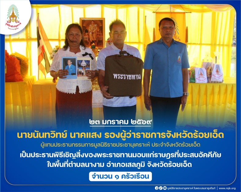 นายนันทวิทย์ นาคแสง รองผู้ว่าราชการจังหวัดร้อยเอ็ด ผู้แทนประธานกรรมการมูลนิธิราชประชานุเคราะห์ ประจำจังหวัดร้อยเอ็ด เป็นประธานพิธีเชิญสิ่งของพระราชทานมอบแก่ราษฎรที่ประสบอัคคีภัย ในพื้นที่ตำบลนางาม อำเภอเสลภูมิ จังหวัดร้อยเอ็ด จำนวน ๑ ครัวเรือน