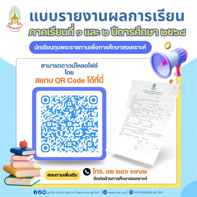 📘ฝ่ายการศึกษาสงเคราะห์ มูลนิธิราชประชานุเคราะห์ฯ ประชาสัมพันธ์การดาวน์โหลดแบบรายงานผลการเรียน ภาคเรียนที่ ๑ และภาคเรียนที่ ๒ ปีการศึกษา ๒๕๖๘ นักเรียนทุนพระราชทานเพื่อการศึกษาสงเคราะห์