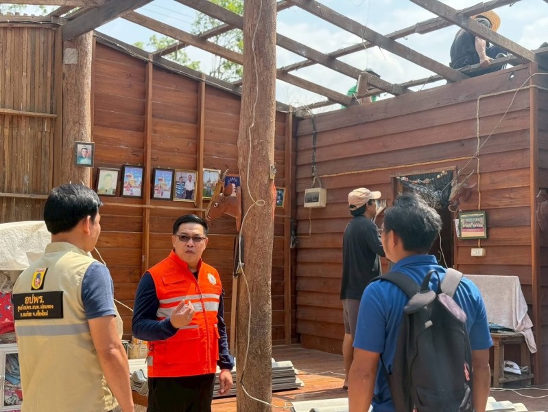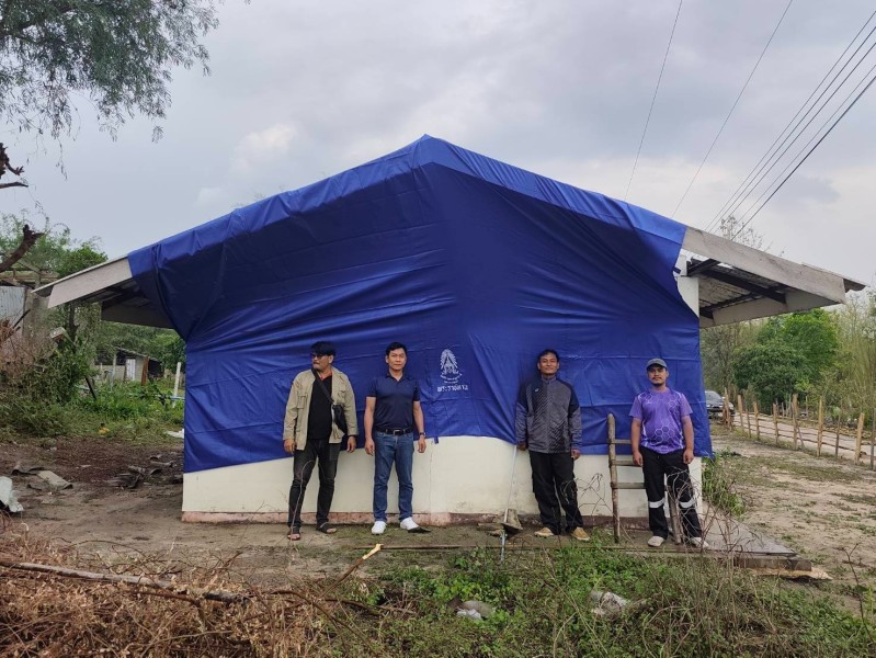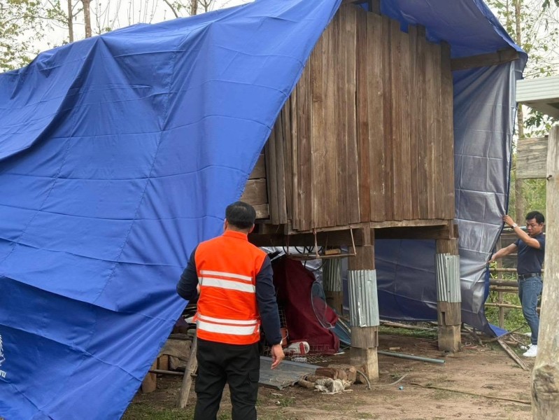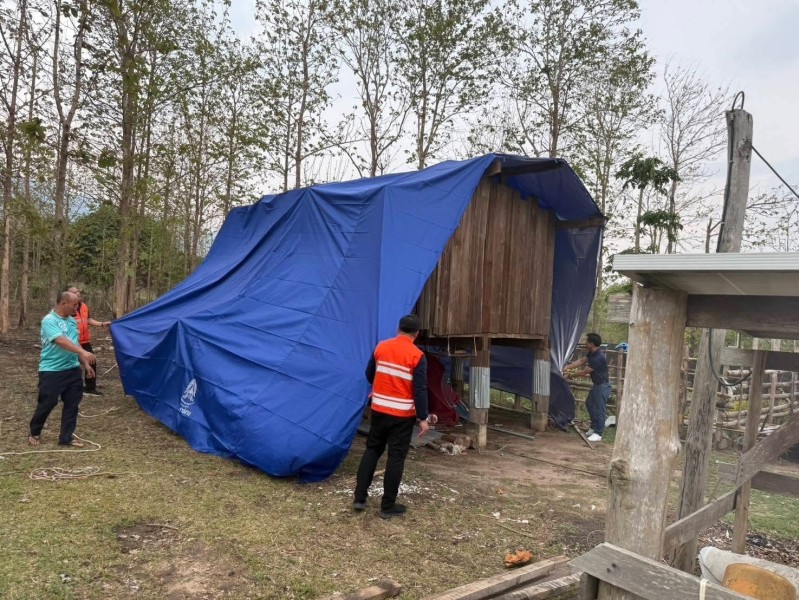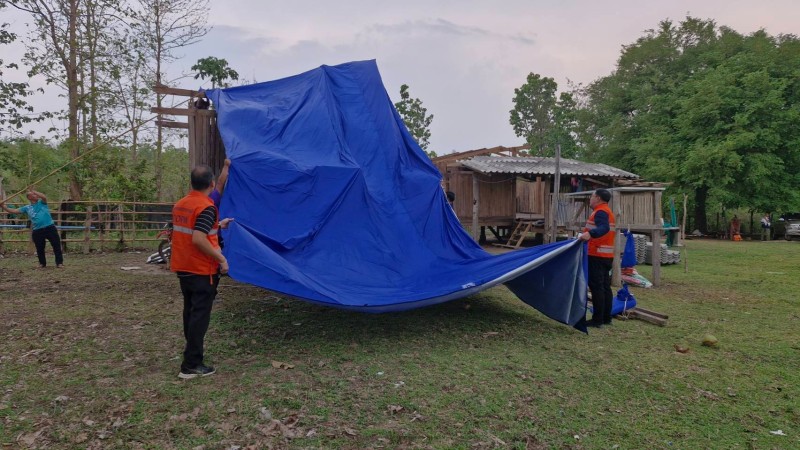นายปรีชาพล พูลทวี นายอำเภออมก๋อย กรรมการ มูลนิธิราชประชานุเคราะห์ประจำจังหวัดเชียงใหม่ มอบผ้าใบพระราชทานแก่ราษฎรที่ประสบวาตภัย ในพื้นที่ตำบลแม่ตื่น และตำบลม่อนจอง อำเภออมก๋อย จังหวัดเชียงใหม่ จำนวน ๘ ครัวเรือน เพื่อบรรเทาความเดือนร้อนในเบื้องต้น ในห้วงเวลาระหว่างซ่อมแซมบ้านแล้วเสร็จ