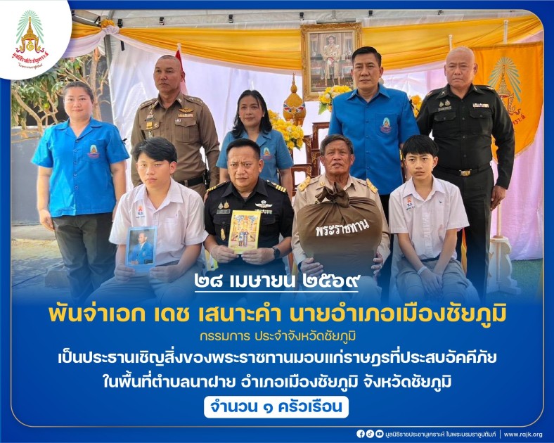 พันจ่าเอก เดช เสนาะคำ นายอำเภอเมืองชัยภูมิ กรรมการ ประจำจังหวัดชัยภูมิ เป็นประธานเชิญสิ่งของพระราชทานมอบแก่ราษฎรที่ประสบอัคคีภัย ในพื้นที่ตำบลนาฝาย อำเภอเมืองชัยภูมิ จังหวัดชัยภูมิ จำนวน ๑ ครัวเรือน